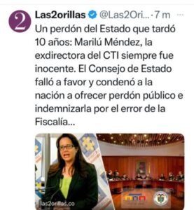 MARILÚ MÉNDEZ recobró la libertad al ser declarada inocente y empezó otra batalla, esta vez, para recuperar el buen nombre mancillado por las publicaciones periodísticas, además de reclamarle al Estado una indemnización que la resarciera moral y materialmente por los daños que este «Falso Positivo» judicial le causó a ella y a su familia y a su carrera profesional, pues fue imposible que otra entidad estatal o privada la contratara, pese a su excelente trayectoria, hoja de vida y su laureado pasado en la Administración Pública.