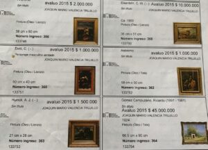 Por lo visto, «El caballista» no tenía un gusto muy definido por el Arte. En su poder había bodegones, paisajes, retratos de reyes y/o duques, santos, cristos, mujeres de Realezas europeas, fachadas, playas, etc, la mayoría «Sin título» y algunas de autor «Desconocido». Hay unas de bajo precio, apenas 5 millones, pero otras que casi alcanzan los 100 millones de pesos, según los avalúos vigentes.
